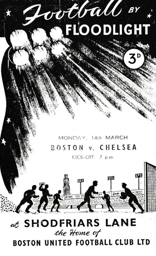 Boston United were one of the pioneers of floodlit football. Before floodlights daylight hours determined kick off times. Even on Saturdays during the winter today's usual kick off time of 3pm would be too late, so from October through to February kick off times would be moved earlier to 2:15pm. There were some midweek games. These had early kick off times of around 5:30pm and could only take place in August, early September and April/May. Although the first floodlit football match took place at Bramhall Lane in Sheffield in 1878, it wasn't a great success and floodlights weren't properly introduced to football until the 1950s. It took the football authorities a long time to sanction their use for competitive matches. The first Football League match under floodlights took place at Portsmouth on 22nd February 1956 against Newcastle United. However a few months earlier, in the Midland League, Boston United had played their first floodlit fixture in their Monday evening game against Corby Town on 3rd October 1955.